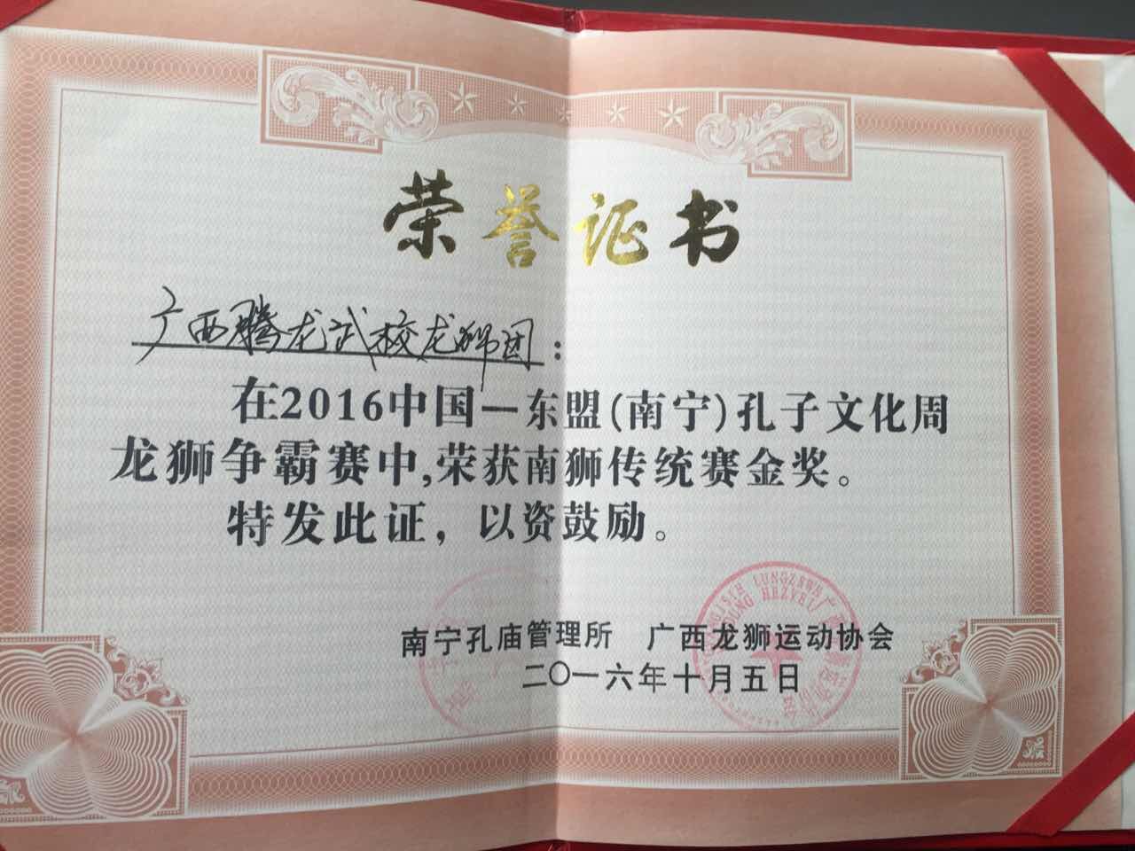 广西腾龙武术学校成立于1990年,下属龙狮团成立于1995年。武校被广西体育局授予“广西区级先进单位”称号。,多年来学员参加全国,省、市级武术散打、狮王大赛,均获得好成绩,其中丁园荣获“广西散打王”称号,黄荣华获得“广西舞王”称号。并有大批学员荣获比赛冠军、龙狮比赛第一名。本校武术表演队及龙狮团先后参加了广西南宁民族运动会开幕式;柳州地王国际、南宁华南城奠基、贵港台泥厂峻工等大型庆典活动。是一一支具有近二十年历史,有较高技术水平的团队,深受全区各届人士的好评。